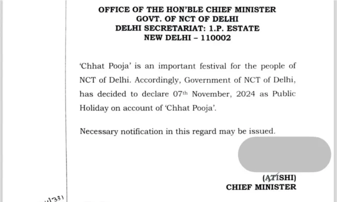 दिल्ली की मुख्यमंत्री आतिशी ने शुक्रवार को छठ पूजा के लिए 7 नवंबर (गुरुवार) को सार्वजनिक अवकाश की घोषणा की।