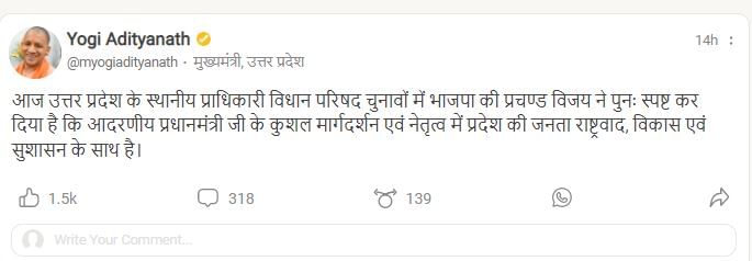 जिलाधिकारी प्रभु एन. सिंह के मुताबिक भाजपा प्रत्याशी को कुल 3471 मिले हैं। निर्दलीय हसनूराम अंबेडकरी को 12, प्रवीण कुमार को 30 और विमल कुमार को 22 वोट मिले हैं। विजयी प्रत्याशी को प्रमाण पत्र नहीं मिला है। डीएम के अनुसार मतगणना रिपोर्ट निर्वाचन आयोग को भेजी गई है। संस्तुति के बाद प्रमाण पत्र जारी किया जाएगा।